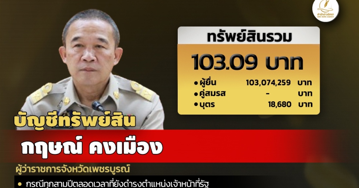 103 ล้าน ทรัพย์สิน 'กฤษณ์ คงเมือง' ผู้ว่าฯ เพชรบูรณ์ รายได้ 1.3 ล./ปี
