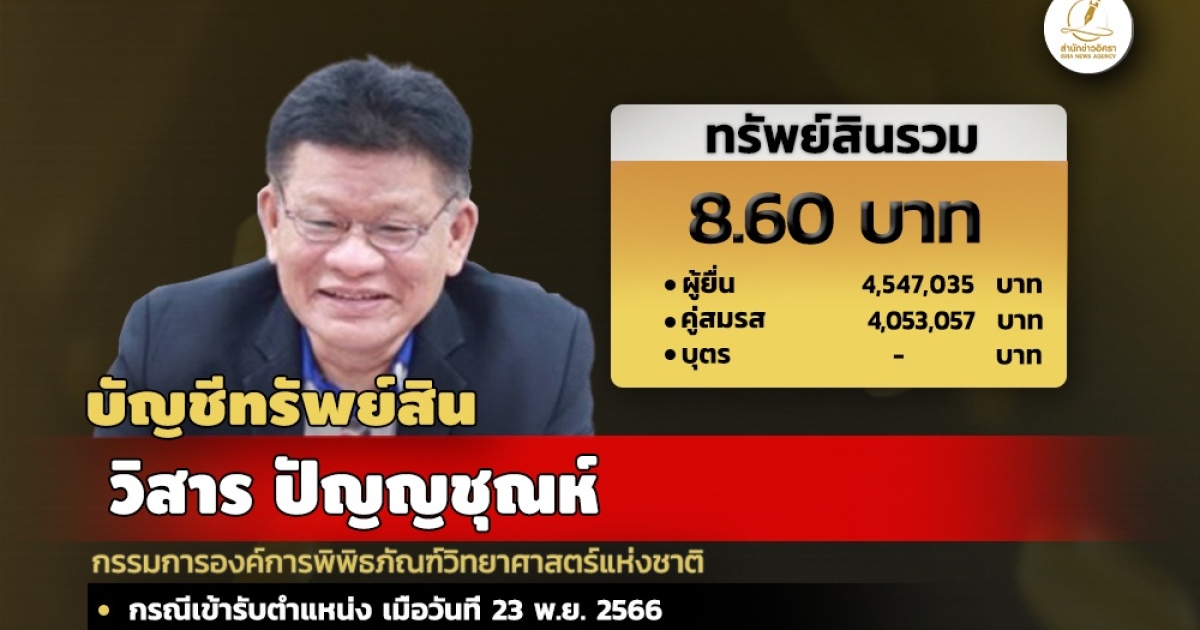 8.60 ล้าน ทรัพย์สิน 'วิสาร ปัญญชุณห์' กรรมการ อพวช. รายได้ 1.2 ล./ปี