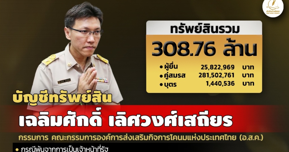สำนักงานคณะกรรมการป้องกันและปราบปรามการทุจริตแห่งชาติ (ป.ป.ช.) เปิดเผยบัญชีแสดงทรัพย์สินและหนี้สินของ เฉลิมศักดิ์ เลิศวงศ์เสถียร คณะกรรมการองค์การส่งเสริมกิจการโคนมแห่งประเทศไทย (อ.ส.ค.) ทรัพย์สิน 308.76 ล. ประกอบด้วย เงินฝาก 48 บัญชี มูลค่ารวม 24.05 ล. ที่ดิน 24 แปลง มูลค่ารวม 19.68 ล. โรงเรือนและสิ่งปลูกสร้าง 11 รายการ มูลค่า 32.13 ล. ทรัพย์สินอื่นๆ กระเป๋าถือ 14 ชิ้น ทองคำแท่งหนัก 10 บาท สร้อยทองหนัก 10 บาท เป็นต้น