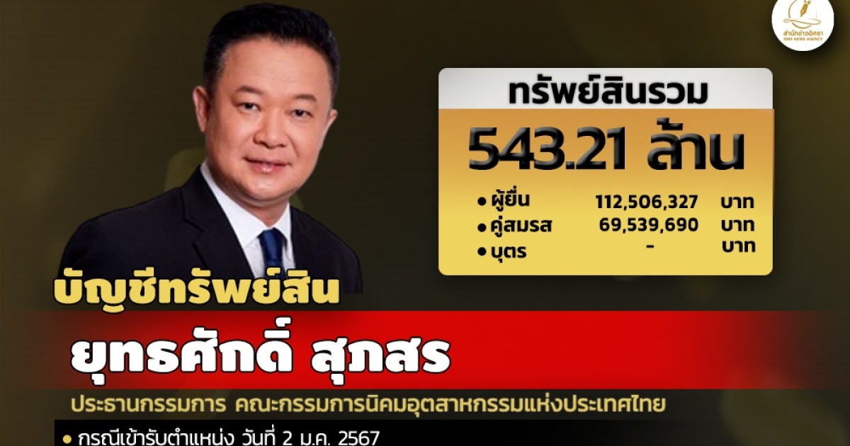 สำนักงานคณะกรรมการป้องกันและปราบปรามการทุจริตแห่งชาติ (ป.ป.ช.) เปิดเผยบัญชีแสดงทรัพย์สินและหนี้สินของ ยุทธศักดิ์ สุภสร ประธานกรรมการ คณะกรรมการนิคมอุตสาหกรรมแห่งประเทศไทย ทรัพย์สิน 543.21 ล. ประกอบด้วย เงินฝาก 7 บัญชี มูลค่ารวม 2.47 ล. ที่ดิน 47 แปลง มูลค่ารวม 494.65 ล. โรงเรือนและสิ่งปลูกสร้าง 8 รายการ มูลค่า 30.05 ล.ทรัพย์สินอื่นๆ เป็น นาฬิกา 3 เรือน แหวนเพชร 5.44 กะรัต 1 วง แหวนเพชร 3 กะรัต 1 วง