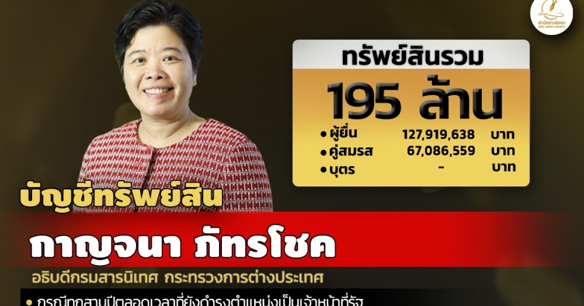 สำนักงานคณะกรรมการป้องกันและปราบปรามการทุจริตแห่งชาติ (ป.ป.ช.) เปิดเผยบัญชีแสดงทรัพย์สินและหนี้สินของ กาญจนา ภัทรโชค อธิบดีกรมสารนิเทศ กระทรวงการต่างประเทศ ทรัพย์สิน 195 ล. ประกอบด้วย เงินฝาก 12 บัญชี มูลค่ารวม 19.52 ล. ที่ดิน 9 แปลง มูลค่ารวม 40.76 ล. โรงเรือนและสิ่งปลูกสร้าง 5 รายการ มูลค่า 63 ล. ทรัพย์สินอื่นๆ เป็นสร้อยคอไข่มุก Mikimoto 2 เส้น สร้อยทองคำหนัก 10 บาท 1 เส้น และแหวนแต่งงานเพชร 1 กะรัต 1 วง