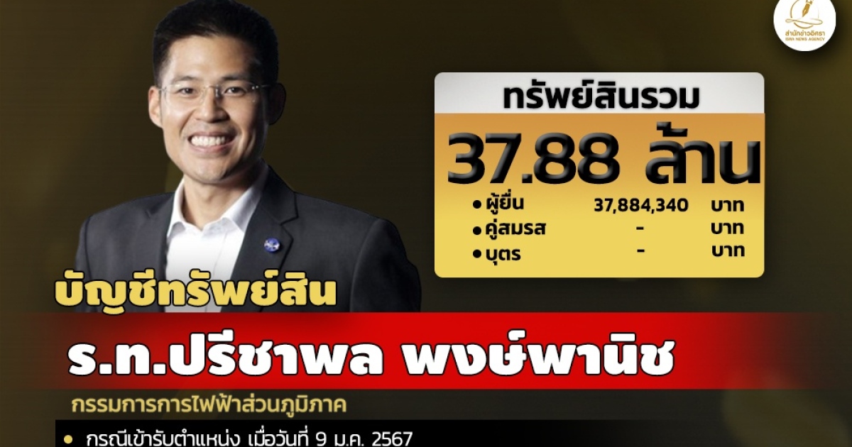 สำนักงานคณะกรรมการป้องกันและปราบปรามการทุจริตแห่งชาติ (ป.ป.ช.) เปิดเผยบัญชีแสดงทรัพย์สินและหนี้สินของ ร.ท.ปรีชาพล พงษ์พานิช กรรมการการไฟฟ้าส่วนภูมิภาค ทรัพย์สิน 37.88 ล. ประกอบด้วย เงินฝาก 9 บัญชี มูลค่ารวม 14.32 ล. ที่ดิน 6 แปลง มูลค่ารวม 12.95 ล. ทรัพย์สินอื่นๆ อาวุธปืน 5 กระบอก สร้อยคอทองคำหนัก 5 บาท พร้อมกรอบพระทองคำพระพุทธชินราชใบเสมา 1 เส้น นาฬิกา 3 เรือน เป็นต้น