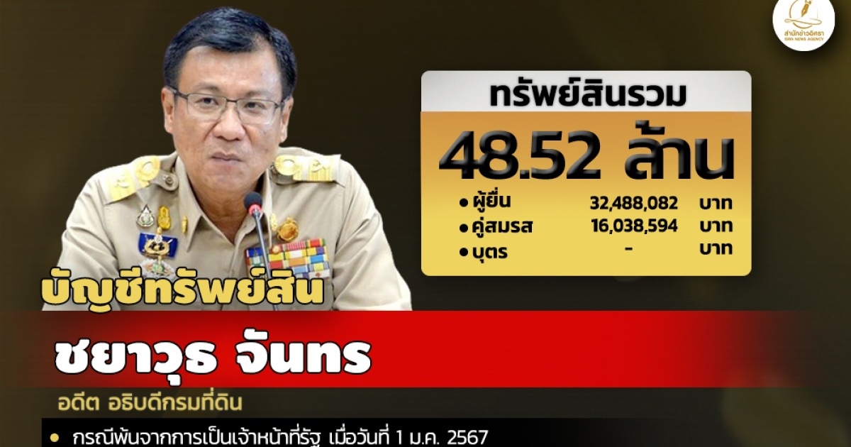 สำนักงานคณะกรรมการป้องกันและปราบปรามการทุจริตแห่งชาติ (ป.ป.ช.) เปิดเผยบัญชีแสดงทรัพย์สินและหนี้สินของ ชยาวุธ จันทร อดีตอธิบดีกรมที่ดิน ทรัพย์สิน 48.52 ล. ประกอบด้วย เงินสด มูลค่า 8 แสนบาท เงินฝาก 11 บัญชี มูลค่ารวม 18.10 ล. ที่ดิน 5 แปลง มูลค่ารวม 20.60 ล. ทรัพย์สินอื่นๆ เช่น แหวน 7 วง สร้อยข้อมือ 3 เส้น ต่างหู 3 คู่ กระเป๋าถือสตรี 4 ใบ เป็นต้น