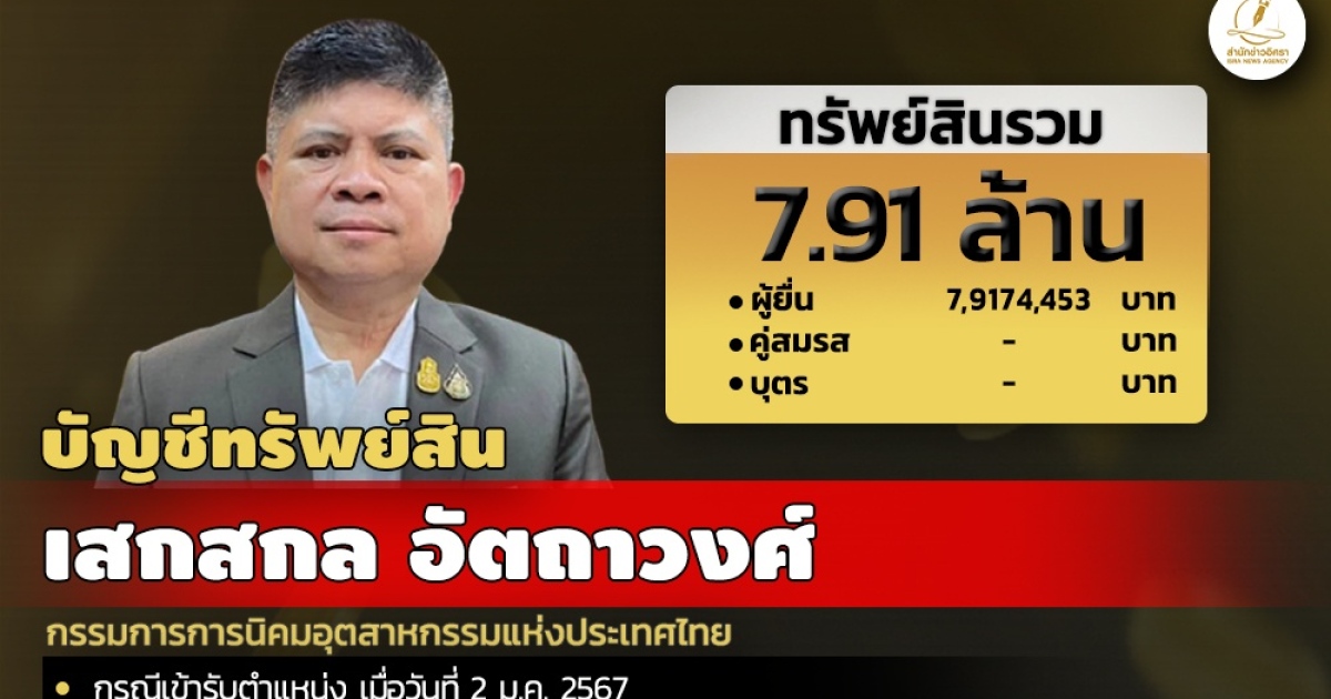 สำนักงานคณะกรรมการป้องกันและปราบปรามการทุจริตแห่งชาติ (ป.ป.ช.) เปิดเผยบัญชีแสดงทรัพย์สินและหนี้สินของ เสกสกล อัตถาวงศ์ กรรมการการนิคมอุตสาหกรรมแห่งประเทศไทย ทรัพย์สิน 7.91ล. ประกอบด้วย เงินฝาก 4 บัญชี มูลค่ารวม 267,453 บาท ที่ดิน 1 แปลง มูลค่ารวม 1.30 ล. โรงเรือนและสิ่งปลูกสร้าง 1 รายการ มูลค่า 4 ล. ทรัพย์สินอื่น 250,000 บาท เป็นนาฬิกา Rolex 1 เรือน
