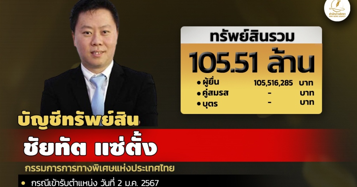 สำนักงานคณะกรรมการป้องกันและปราบปรามการทุจริตแห่งชาติ (ป.ป.ช.) เปิดเผยบัญชีแสดงทรัพย์สินและหนี้สินของ ชัยทัต แซ่ตั้ง กรรมการการทางพิเศษแห่งประเทศไทย ทรัพย์สิน 105.51 ล. ประกอบด้วย เงินฝาก 4 บัญชี มูลค่ารวม 386,285 บาท ที่ดิน 4 แปลง มูลค่ารวม 22.10 ล. โรงเรือนและสิ่งปลูกสร้าง เป็นบ้าน 4 หลัง คอนโด 1 ห้อง มูลค่ารวม 41.90 ล. ทรัพย์สินอื่นๆ เช่น นาฬิกาแบรนด์เนม 12 เรือน พระเลี่ยมทอง 7 องค์ เป็นต้น