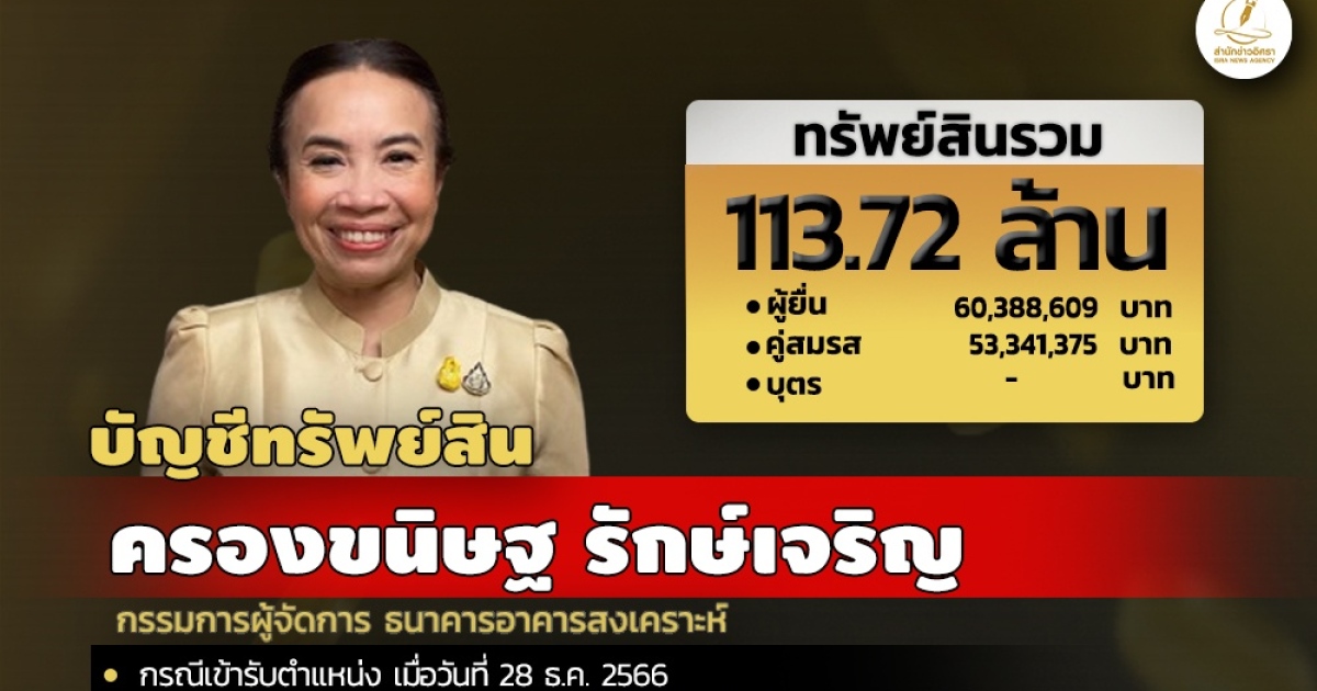 สำนักงานคณะกรรมการป้องกันและปราบปรามการทุจริตแห่งชาติ (ป.ป.ช.) เปิดเผยบัญชีแสดงทรัพย์สินและหนี้สินของ ครองขนิษฐ รักษ์เจริญ อธิบดีกรมยุโรป กระทรวงการต่างประเทศ ทรัพย์สิน 22.05 ล. ประกอบด้วย เงินฝาก 6 บัญชี มูลค่ารวม 2.74 ล. ที่ดิน 4 แปลง มูลค่ารวม 3.51 ล. โรงเรือนและสิ่งปลูกสร้าง เป็นห้องชุด 1 ห้อง มูลค่ารวม 10.24 ล. ทรัพย์สินอื่นๆ เช่น สร้อยคอทองคำ 3 เส้น นาฬิกา 2 เรือน กระเป๋าถือสตรี 4 ใบ ชุดเครื่องประดับ 2 ชุด ต่างหู 7 คู่ แหวนเพชร 4 วง เป็นต้น