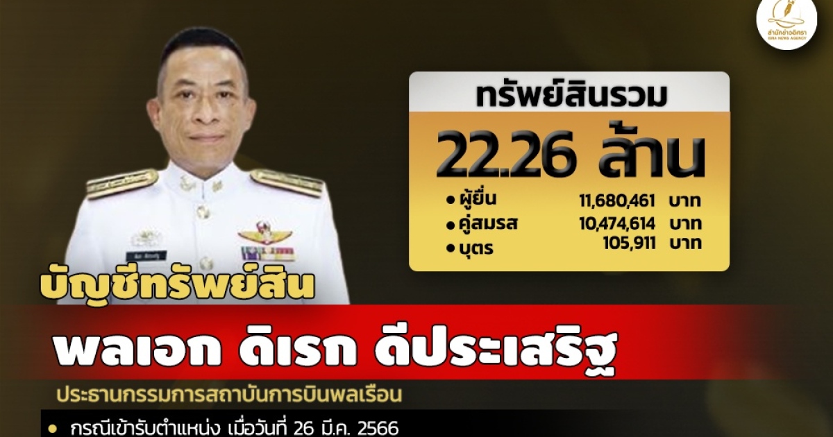 สำนักงานคณะกรรมการป้องกันและปราบปรามการทุจริตแห่งชาติ (ป.ป.ช.) เปิดเผยบัญชีแสดงทรัพย์สินและหนี้สินของ พลเอก ดิเรก ดีประเสริฐ ประธานกรรมการสถาบันการบินพลเรือน ทรัพย์สิน 22.26 ล. ประกอบด้วย เงินฝาก 10 บัญชี มูลค่ารวม 10.39 ล. ที่ดิน 1 แปลง มูลค่า 56,000 ล. โรงเรือนและสิ่งปลูกสร้าง 2 หลัง มูลค่ารวม 8 ล. ทรัพย์สินอื่นๆ เช่น ทองรูปพรรณ 5 เส้น แหวนทอง 4 วง ตุ้มหู 2 คู่ แหวน 2 วง สร้อยข้อมือ 1 เส้น