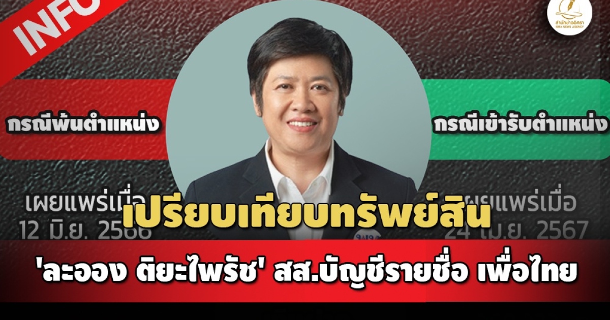 - INFO: ทรัพย์สิน 26.64 ล. 'ละออง ติยะไพรัช' สส.เชียงราย พรรคเพื่อไทย
