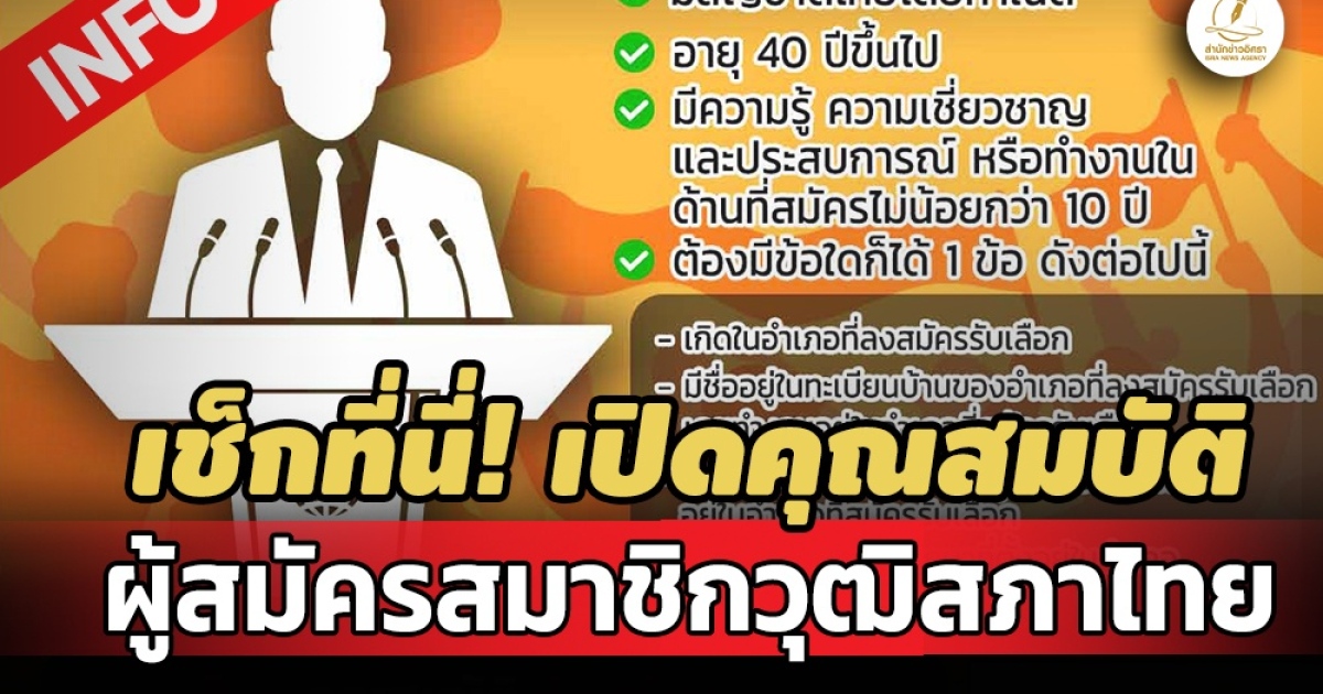 เมื่อวันที่ 13 พ.ค. 2567 เว็บไซต์ราชกิจจานุเบกษา เผยแพร่ประกาศคณะกรรมการการเลือกตั้ง เรื่อง กำหนดวันเลือกและวันรับสมัครรับเลือกสมาชิกวุฒิสภา สำนักข่าวอิศรา จึงสรุปคุณสมบัติของผู้สมัครสมาชิกวุฒิสภาไทย มานำเสนอผ่านภาพอินโฟกราฟิก ดังนี้