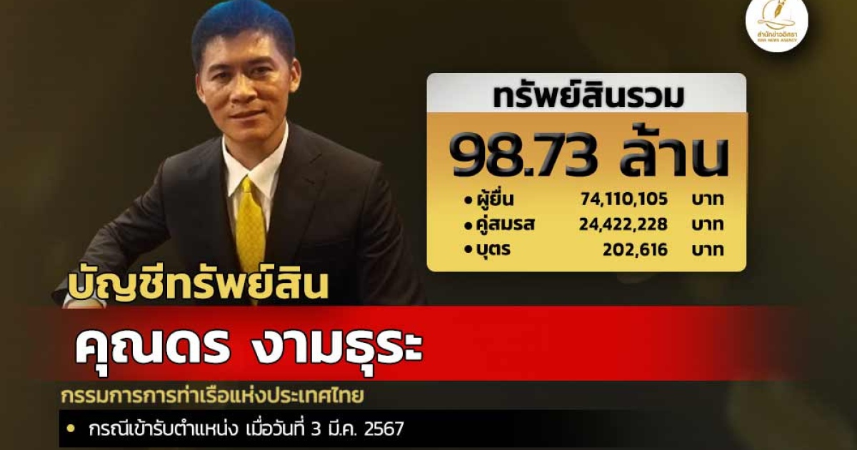 สำนักงานคณะกรรมการป้องกันและปราบปรามการทุจริตแห่งชาติ (ป.ป.ช.) เปิดเผยบัญชีแสดงทรัพย์สินและหนี้สินของ คุณดร งามธุระ กรรมการการการท่าเรือแห่งประเทศไทย ทรัพย์สิน 98.73 ล. ประกอบด้วย เงินสด มูลค่า 3 ล. เงินฝาก 24 บัญชี มูลค่ารวม 3.87 ล. โรงเรือนและสิ่งปลูกสร้าง 30 รายการ มูลค่ารวม 27 ล. ทรัพย์สินอื่น เช่น อาวุธปืนรีวอลเวอร์ขนาด.357 พระขุนแผนเลี่ยมทอง ฯลฯ