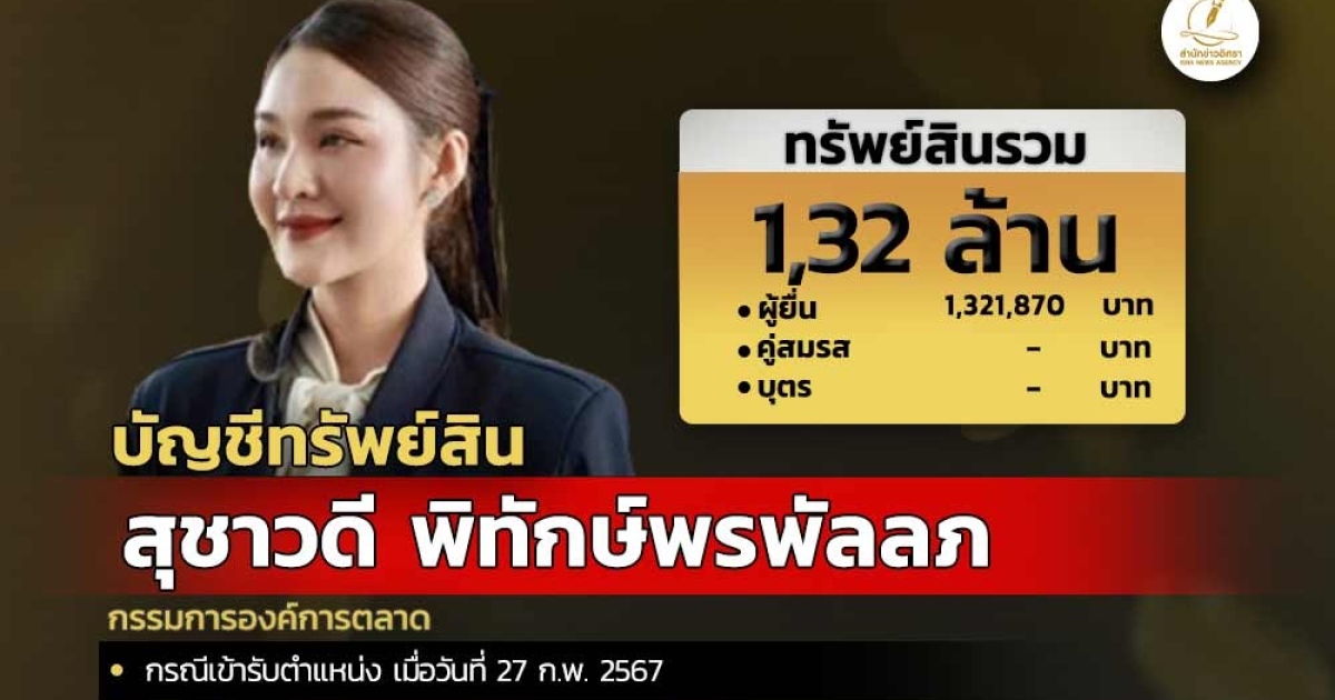 1.3 ล้าน ทรัพย์สิน 'สุชาวดี พิทักษ์พรพัลลภ' กก.องค์การตลาด รายได้ 5.16 แสน/ปี