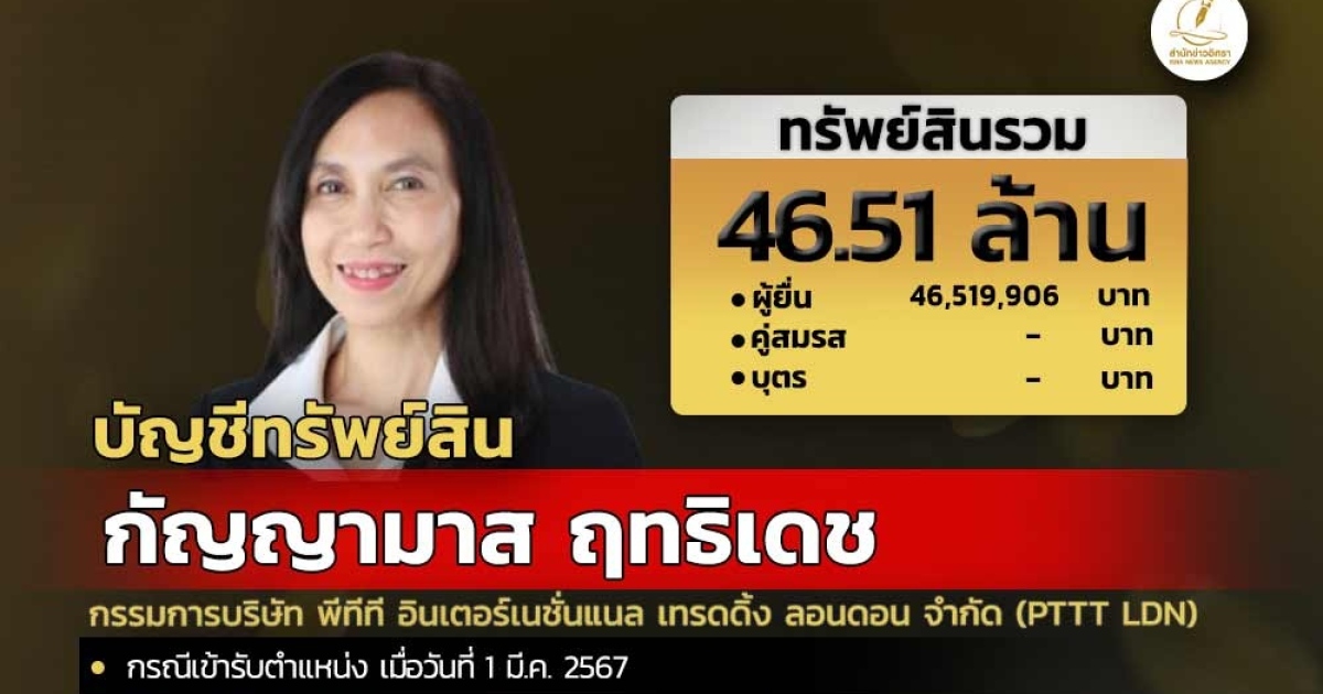 สำนักงานคณะกรรมการป้องกันและปราบปรามการทุจริตแห่งชาติ (ป.ป.ช.) เปิดเผยบัญชีแสดงทรัพย์สินและหนี้สินของ กัญญามาส ฤทธิเดช กรรมการบริษัท พีทีที อินเตอร์เนชั่นแนล เทรดดิ้ง ลอนดอน จำกัด (PTTT LDN) ทรัพย์สิน 46.51 ล. ประกอบด้วย เงินฝาก 9 บัญชี รวมมูลค่า 68.95 ล.ยานพาหนะ 680,000 บาท สิทธิและสัมปทาน 12.95 ล.