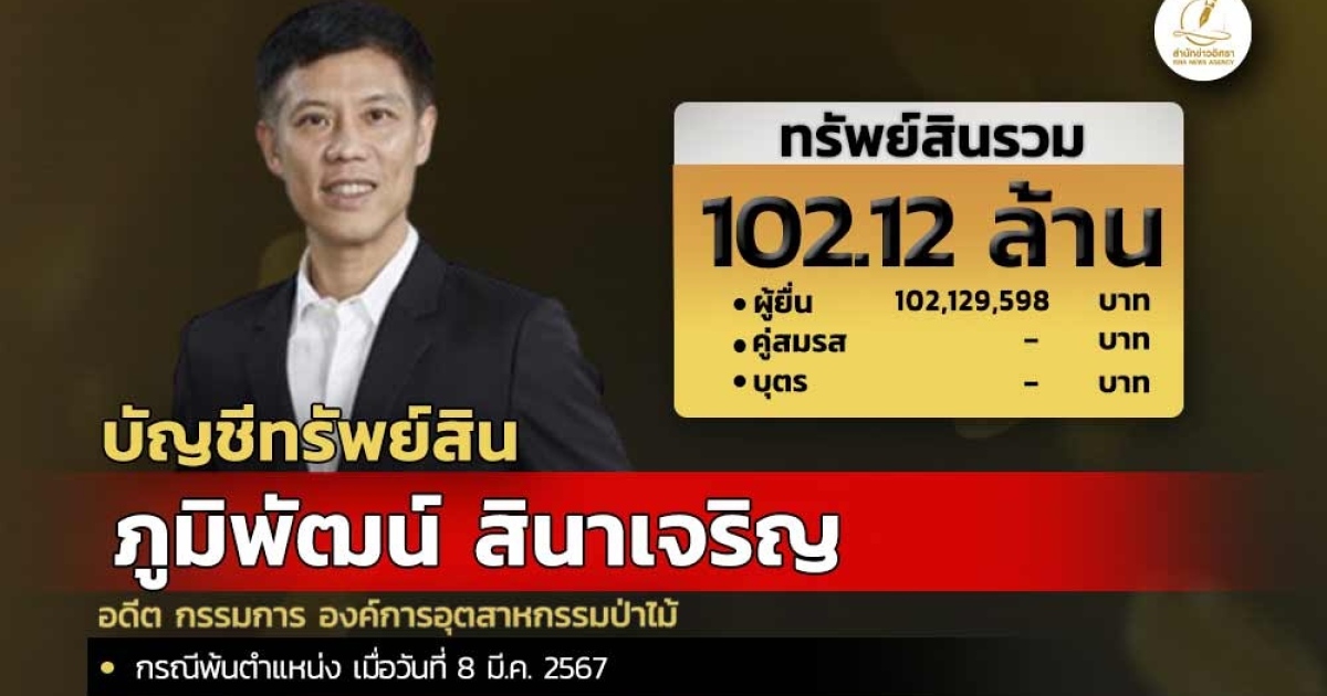 สำนักงานคณะกรรมการป้องกันและปราบปรามการทุจริตแห่งชาติ (ป.ป.ช.) เปิดเผยบัญชีแสดงทรัพย์สินและหนี้สินของ ภูมิพัฒน์ สินาเจริญ กรรมการ องค์การอุตสาหกรรมป่าไม้ ทรัพย์สิน 102.12 ล. ประกอบด้วย เงินสด 300,000 บาท เงินฝาก 5 บัญชี รวมมูลค่า 198,995 บาท โรงเรือนและสิ่งปลูกสร้าง 10 หลัง มูลค่ารวม 203.29 ล. ทรัพย์สินอื่น เป็นพระแก้วมรกตทองแท้ 50 องค์ มูลค่า 1.70 ล.