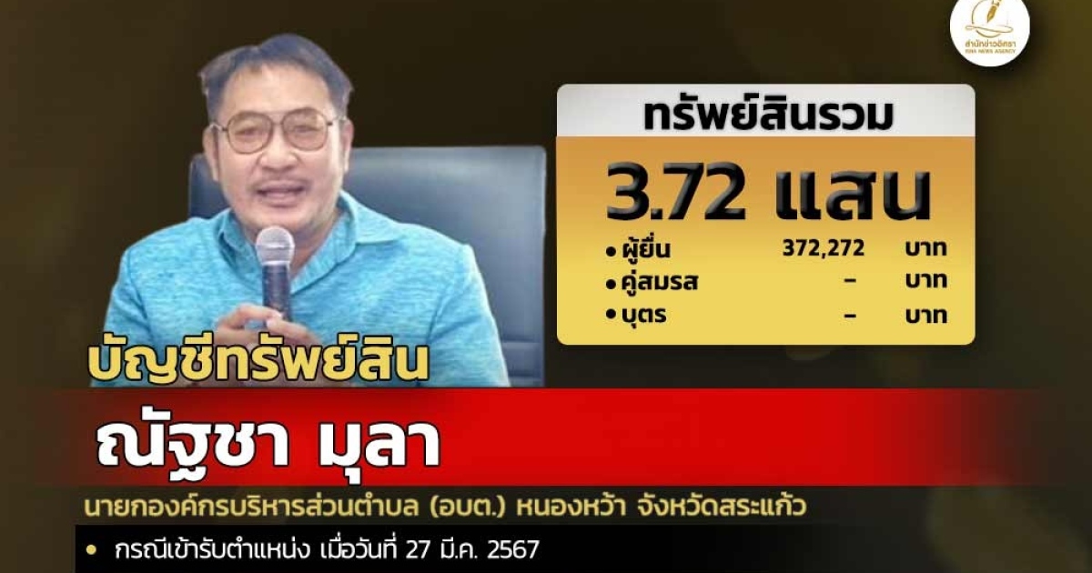 สำนักงานคณะกรรมการป้องกันและปราบปรามการทุจริตแห่งชาติ (ป.ป.ช.) เปิดเผยบัญชีแสดงทรัพย์สินและหนี้สินของ ณัฐชา มุลา นายกองค์กรบริหารส่วนตำบล (อบต.) หนองหว้า จังหวัดสระแก้ว ทรัพย์สิน 3.72 แสน. ประกอบด้วย เงินฝาก 1 บัญชี มูลค่า 72,272 บาท ยานพาหนะ รถยนต์ 1 คัน มูลค่า 300,000 บาท