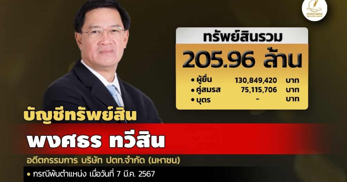 สำนักงานคณะกรรมการป้องกันและปราบปรามการทุจริตแห่งชาติ (ป.ป.ช.) เปิดเผยบัญชีแสดงทรัพย์สินและหนี้สินของ พงศธร ทวีสิน อดีตกรรมการ บริษัท ปตท.จำกัด (มหาชน) ทรัพย์สิน 205.96 แสน. ประกอบด้วย เงินฝาก 18 บัญชี มูลค่ารวม 58.87 ล. ที่ดิน 6 แปลง มูลค่ารวม 29.87 ล. โรงเรือนและสิ่งปลูกสร้าง 4 หลัง มูลค่ารวม 31.33 ล. ทรัพย์สินอื่น มูลค่ารวม 15 ล.