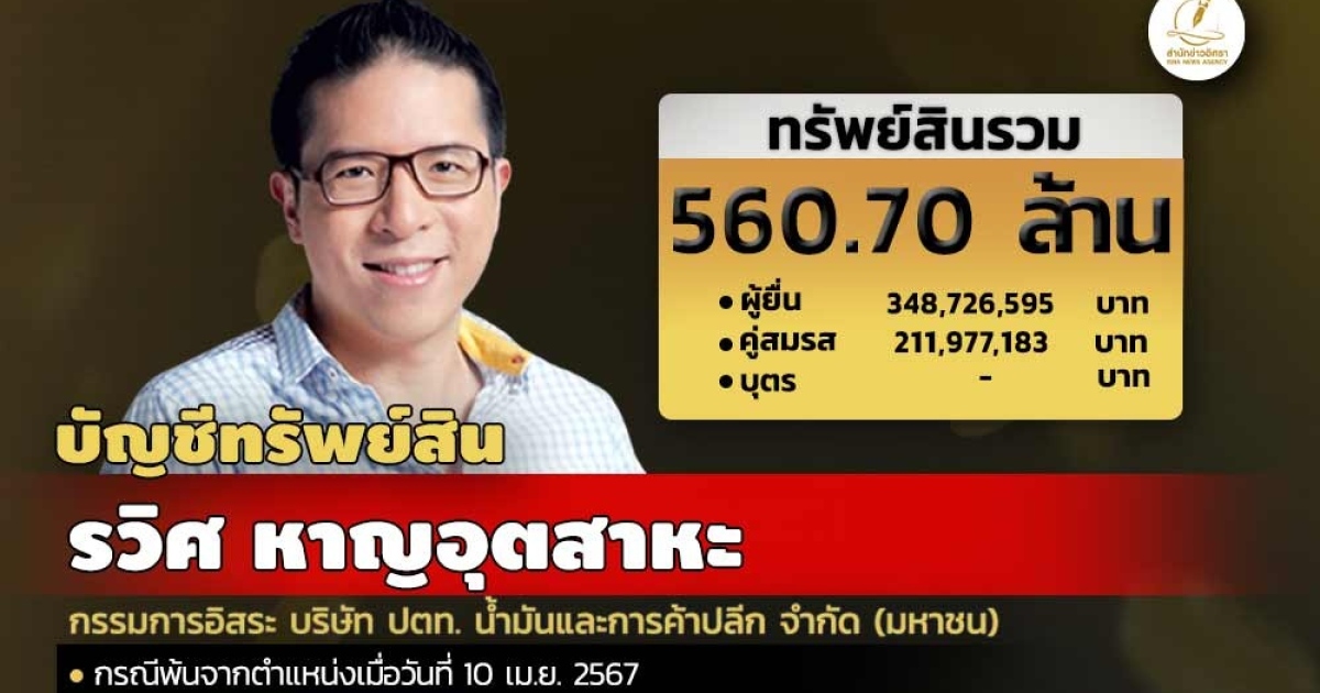 สำนักงานคณะกรรมการป้องกันและปราบปรามการทุจริตแห่งชาติ (ป.ป.ช.) เปิดเผยบัญชีแสดงทรัพย์สินและหนี้สินของ รวิศ หาญอุตสาหะ กรรมการอิสระ บริษัท ปตท. น้ำมันและการค้าปลีก จำกัด (มหาชน) ทรัพย์สิน 560.70 ล. ประกอบด้วย เงินฝาก 21 บัญชี มูลค่ารวม 12.30 ล. ที่ดิน 22 แปลง มูลค่ารวม 351.68 ล. โรงเรือนและสิ่งปลูกสร้าง 4 หลัง มูลค่ารวม 62.40 ล.
