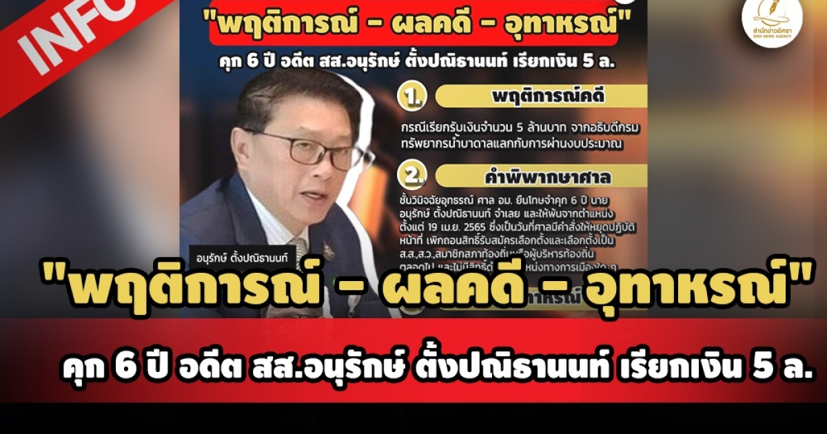 กรณีสำนักข่าวอิศรา รายงานผลการอ่านคำพิพากษาชั้นวินิจฉัยอุทธรณ์ โดยศาลฎีกาแผนกคดีอาญาของผู้ดำรงตำแหน่งทางการเมือง คดีอม.อธ.7/2566 ระหว่างอัยการสูงสุด โจทก์ นายอนุรักษ์ ตั้งปณิธานนท์ อดีตสส.มุกดาหาร พรรคเพื่อไทย จำเลย กรณีเรียกรับเงินจำนวน 5 ล้านบาท จากอธิบดีกรมทรัพยากรน้ำบาดาลแลกกับการผ่านงบประมาณ สำนักข่าวอิศรา จึงสรุปข้อมูล มานำเสนอผ่านภาพอินโฟกราฟิก ดังนี้