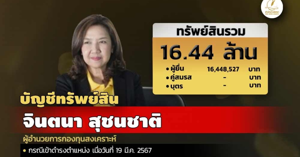 สำนักงานคณะกรรมการป้องกันและปราบปรามการทุจริตแห่งชาติ (ป.ป.ช.) เปิดเผยบัญชีแสดงทรัพย์สินและหนี้สินของ จินตนา สุชนชาติผู้อำนวยการกองทุนสงเคราะห์ ทรัพย์สิน 16.44 ล. ประกอบด้วย เงินฝาก 9 บัญชี มูลค่ารวม 63,426 ล. ที่ดิน 2 แปลง มูลค่ารวม 6.40 ล.โรงเรือนและสิ่งปลูกสร้าง 2 หลัง มูลค่ารวม 2 ล.