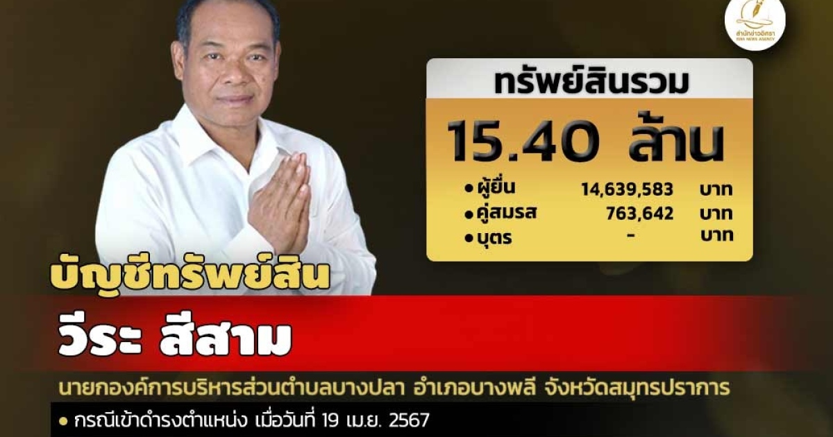 สำนักงานคณะกรรมการป้องกันและปราบปรามการทุจริตแห่งชาติ (ป.ป.ช.) เปิดเผยบัญชีแสดงทรัพย์สินและหนี้สินของ วีระ สีสาม นายกองค์การบริหารส่วนตำบลบางปลา อำเภอบางพลี จังหวัดสมุทรปราการ ทรัพย์สิน 15.40 ล. ประกอบด้วย เงินฝาก 3 บัญชี มูลค่ารวม 10,071 บาท ยานพาหนะ รถยนต์ 9 คัน รถจักรยานยนต์ 2 คัน รวมมูลค่า 13.64 ล. ทรัพย์สินอื่น ได้แก่ แหวนเพชร สร้อยคอและสร้อยข้อมือทองคำ