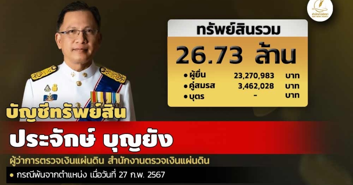 สำนักงานคณะกรรมการป้องกันและปราบปรามการทุจริตแห่งชาติ (ป.ป.ช.) เปิดเผยบัญชีแสดงทรัพย์สินและหนี้สินของ ประจักษ์ บุญยัง ผู้ว่าการตรวจเงินแผ่นดิน สำนักงานตรวจเงินแผ่นดิน ทรัพย์สิน 26.73 ล. ประกอบด้วย เงินฝาก 9 บัญชี มูลค่ารวม 821,415 บาท ที่ดิน 4 แปลง รวมมูลค่า 20.88 ล. โรงเรือนและสิ่งปลูกสร้าง 2 หลัง มูลค่ารวม 2.82 ล. ทรัพย์สินอื่น ได้แก่ สร้อยคอทองคำ กำไรทอง สร้อยข้อมือทองคำ แหวนเพชร เป็นต้น