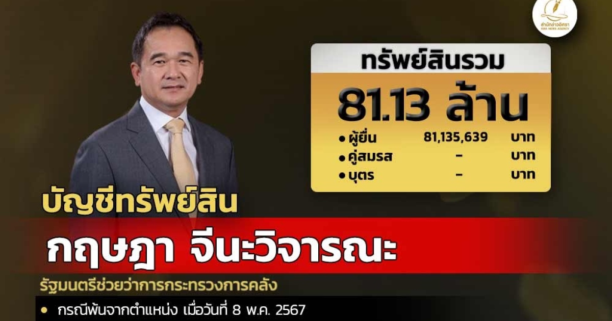 สำนักงานคณะกรรมการป้องกันและปราบปรามการทุจริตแห่งชาติ (ป.ป.ช.) เปิดเผยบัญชีแสดงทรัพย์สินและหนี้สินของ กฤษฎา จีนะวิจารณะ รัฐมนตรีช่วยว่าการกระทรวงการคลัง ทรัพย์สิน 81.13 ล. ประกอบด้วย เงินฝาก 3 บัญชี มูลค่ารวม 13.52 ล. ที่ดิน 1 แปลง มูลค่า 2 ล. ยานพาหนะ รถยนต์ 1 คัน มูลค่า 3.12 ล. ผู้ยื่น แจ้งมีรายได้ต่อปีโดยประมาณ 18.37 ล.