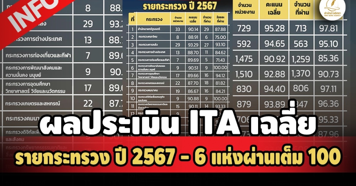 ป.ป.ช. ประกาศผล ITA ของหน่วยงานภาครัฐ ประจำปีงบประมาณ พ.ศ. 2567 สำนักข่าวอิศราสรุปข้อมูลมานำเสนอผ่านภาพอินโฟกราฟิก ในส่วนของรายกระทรวงจำนวน 21 กระทรวง ในจำนวนนี้มี 6 กระทรวงที่หน่วยงานในกระทรวงได้คะแนนผ่านครบทุกหน่วยงาน คิดเป็น 100 % ขณะที่รายพื้นที่ภาค พื้นที่ภาค 1 ได้คะแนนมากที่สุด