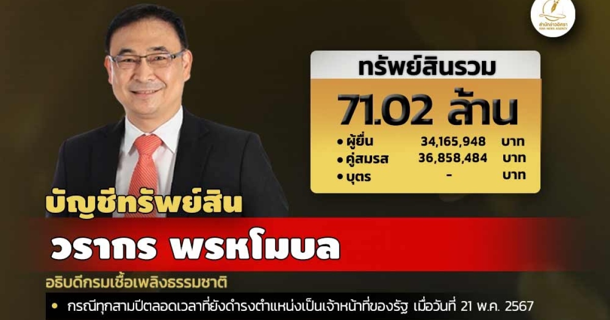 สำนักงานคณะกรรมการป้องกันและปราบปรามการทุจริตแห่งชาติ (ป.ป.ช.) เปิดเผยบัญชีแสดงทรัพย์สินและหนี้สินของ วรากร พรหโมบล อธิบดีกรมเชื้อเพลิงธรรมชาติ ทรัพย์สิน 71.02 ล. ประกอบด้วย เงินฝาก 8 บัญชี มูลค่ารวม 1.85 ล. ที่ดิน 6 แปลง มูลค่ารวม 43.70 ล. โรงเรือนและสิ่งปลูกสร้าง 3 หลัง มูลค่ารวม 6.59 ล. ผู้ยื่น แจ้งมีรายได้ต่อปีโดยประมาณ 2.63 ล.