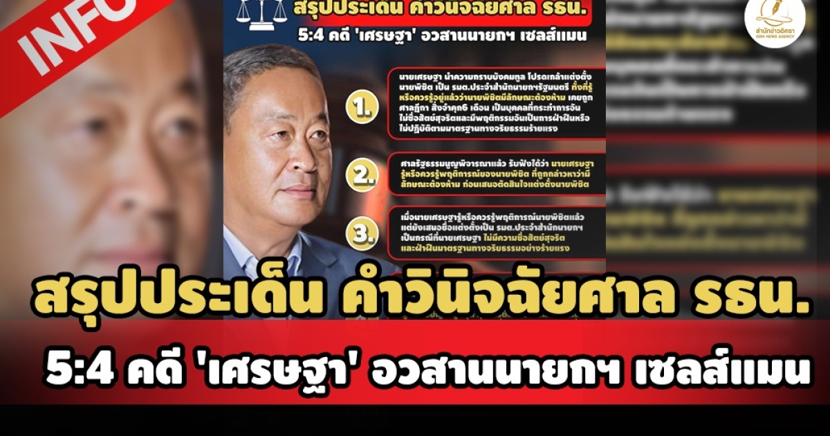เมื่อวันที่ 14 ส.ค. 2567 ตุลาการศาลรัฐธรรมนูญ ได้อ่านคำวินิจฉัย ลงมติเสียงข้างมาก 5 ต่อ 4 ให้นายเศรษฐา ทวีสิน นายกรัฐมนตรีให้พ้นจากตำแหน่งนายกรัฐมนตรี จากกรณีนายเศรษฐาได้นำความกราบบังคมทูล เพื่อโปรดเกล้าแต่งตั้งนายพิชิต ชื่นบาน เป็นรัฐมนตรีประจำสำนักนายกรัฐมนตรี ทั้งที่รู้หรือควรรู้อยู่แล้วว่านายพิชิตขาดคุณสมบัติหรือมีลักษณะต้องห้ามตามรัฐธรรมนูญ สำนักข่าวอิศรา จึงสรุปข้อมูล มานำเสนอผ่านภาพอินโฟกราฟิก ดังนี้