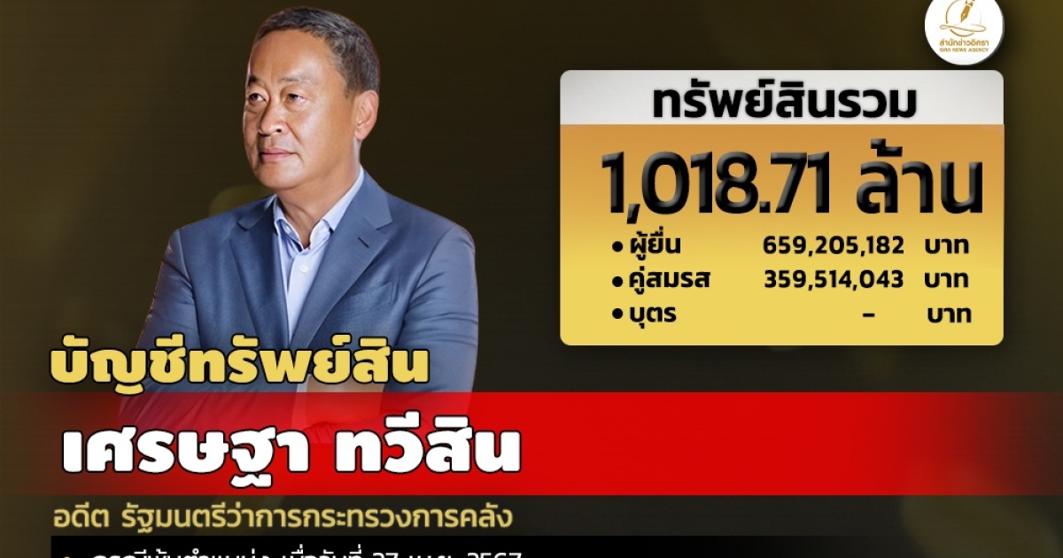 สำนักงานคณะกรรมการป้องกันและปราบปรามการทุจริตแห่งชาติ (ป.ป.ช.) เปิดเผยบัญชีแสดงทรัพย์สินและหนี้สินของ เศรษฐา ทวีสิน อดีต รัฐมนตรีว่าการกระทรวงการคลัง ทรัพย์สิน 1,018.71 ล. ประกอบด้วย เงินฝาก 86 บัญชี มูลค่ารวม 174.71 ล. ที่ดิน 1 แปลง มูลค่า 158.40 ล. โรงเรือนและสิ่งปลูกสร้าง ห้องชุด 1 หน่วย มูลค่า 156.42 ล. ผู้ยื่นแจ้งมีรายได้ต่อปี 23.35 ล.