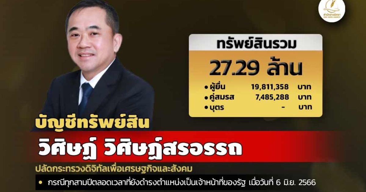 สำนักงานคณะกรรมการป้องกันและปราบปรามการทุจริตแห่งชาติ (ป.ป.ช.) เปิดเผยบัญชีแสดงทรัพย์สินและหนี้สินของ วิศิษฏ์ วิศิษฏ์สรอรรถ ปลัดกระทรวงดิจิทัลเพื่อเศรษฐกิจและสังคม ทรัพย์สิน 27.29 ล. ประกอบด้วย เงินฝาก 11 บัญชี มูลค่ารวม 7.10 ล. ที่ดิน 2 แปลง มูลค่ารวม 7.28 ล. ผู้ยื่นแจ้งมีรายได้ต่อปี 1.37 ล. เป็น ประกอบด้วย เงินเดือน, โบนัส,ค่าตอบแทน, เบี้ยประชุมกรรมการรัฐวิสาหกิจ