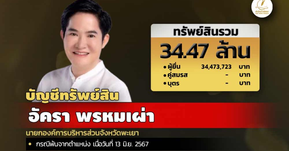 สำนักงานคณะกรรมการป้องกันและปราบปรามการทุจริตแห่งชาติ (ป.ป.ช.) เปิดเผยบัญชีแสดงทรัพย์สินและหนี้สินของอัครา พรหมเผ่า อดีต นายกองค์การบริหารส่วนจังหวัดพะเยา ทรัพย์สิน 34.47 ล. ประกอบด้วย เงินฝาก 3 บัญชี มูลค่ารวม 203,048 บาท ที่ดิน 11 แปลง มูลค่ารวม 23.81 ล. ผู้ยื่นแจ้งมีรายได้ต่อปี 3.30 ล. เป็น เงินเดือนบ.สบายใจมาร์เก็ต , เงินเดือน อบจ. , ค่าตอบแทนพิเศษ อบจ. , ค่าตอบแทนประจำตำแหน่ง