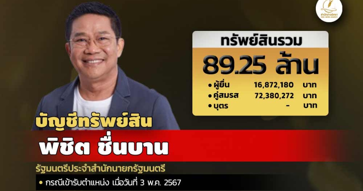สำนักงานคณะกรรมการป้องกันและปราบปรามการทุจริตแห่งชาติ (ป.ป.ช.) เปิดเผยบัญชีแสดงทรัพย์สินและหนี้สินของ พิชิต ชื่นบาน รัฐมนตรีประจำสำนักนายกรัฐมนตรี ทรัพย์สิน 89.25 ล. ประกอบด้วย เงินฝาก 19 บัญชี มูลค่ารวม 9.20 ล. ที่ดิน 8 แปลง มูลค่ารวม 15.76 ล. โรงเรือนและสิ่งปลูกสร้าง 3 หลัง มูลค่ารวม 6.67 ล. ผู้ยื่นแจ้งมีรายได้ต่อปี 1.73 ล.