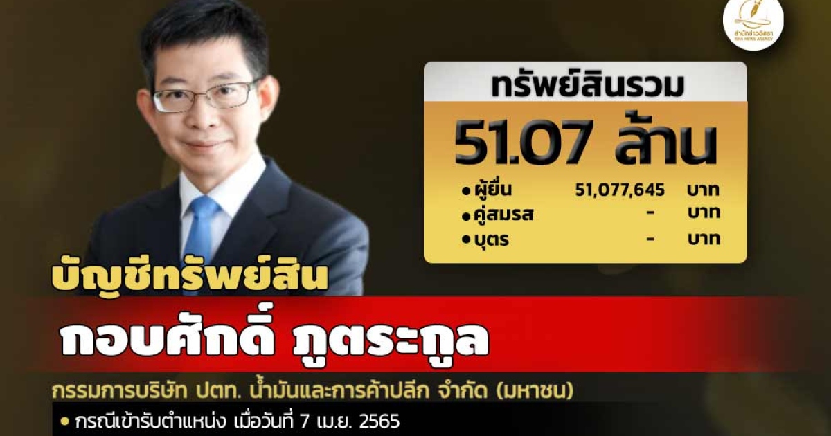 สำนักงานคณะกรรมการป้องกันและปราบปรามการทุจริตแห่งชาติ (ป.ป.ช.) เปิดเผยบัญชีแสดงทรัพย์สินและหนี้สินของ กอบศักดิ์ ภูตระกูล กรรมการบริษัท ปตท. น้ำมันและการค้าปลีก จำกัด (มหาชน) ทรัพย์สิน 51.07 ล. ประกอบด้วย เงินฝาก 12 บัญชี มูลค่ารวม 538,812 บาท ที่ดิน 7 แปลง มูลค่ารวม 9.44 ล. โรงเรือนและสิ่งปลูกสร้าง 2 หลัง มูลค่ารวม 22.20 ล. ผู้ยื่นแจ้งมีรายได้ต่อปี 19.76 ล.