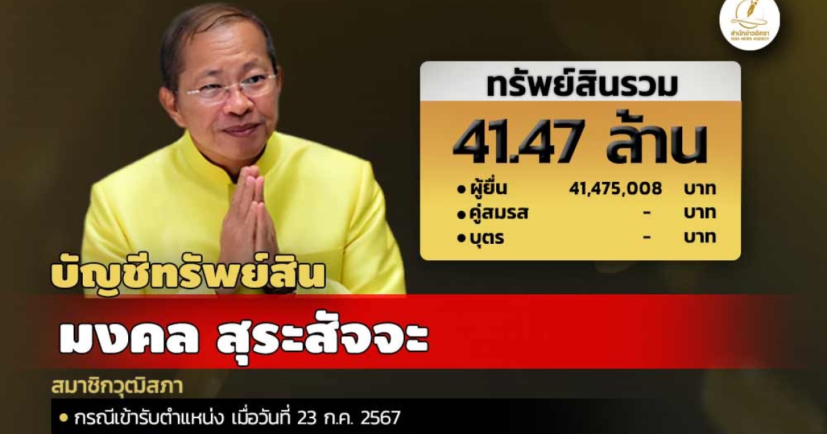สำนักงานคณะกรรมการป้องกันและปราบปรามการทุจริตแห่งชาติ (ป.ป.ช.) เปิดเผยบัญชีแสดงทรัพย์สินและหนี้สินของ มงคล สุระสัจจะ สมาชิกวุฒิสภา ทรัพย์สิน 41.47 ล. ประกอบด้วย เงินฝาก 15 บัญชี มูลค่ารวม 12.52 ล. ที่ดิน 21 แปลง มูลค่ารวม 10.07 ล. โรงเรือนและสิ่งปลูกสร้าง 12 หลัง มูลค่ารวม 10.18 ล. ผู้ยื่นแจ้งมีรายได้ต่อปี 1.76 ล.