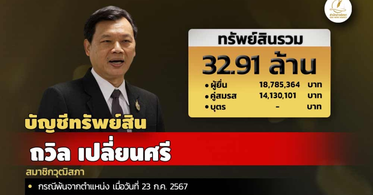 สำนักงานคณะกรรมการป้องกันและปราบปรามการทุจริตแห่งชาติ (ป.ป.ช.) เปิดเผยบัญชีแสดงทรัพย์สินและหนี้สินของ ถวิล เปลี่ยนศรี สมาชิกวุฒิสภา ทรัพย์สิน 32.91 ล. ประกอบด้วย เงินฝาก 10 บัญชีี มูลค่ารวม 2.33 ล. โรงเรือนและสิ่งปลูกสร้าง 2 หลัง มูลค่ารวม 5.75 ล. ผู้ยื่นมีรายได้ต่อปีโดยประมาณ 2.10 ล.