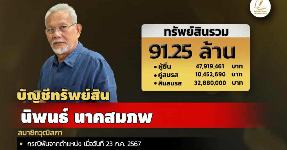สำนักงานคณะกรรมการป้องกันและปราบปรามการทุจริตแห่งชาติ (ป.ป.ช.) เปิดเผยบัญชีแสดงทรัพย์สินและหนี้สินของ นิพนธ์ นาคสมภพ สมาชิกวุฒิสภา ทรัพย์สิน 91.25 ล. ประกอบด้วย เงินฝาก 14 บัญชี มูลค่ารวม 9.55 ล. โรงเรือนและสิ่งปลูกสร้าง 1 หลัง มูลค่า 20 ล. ผู้ยื่นมีรายได้ต่อปีโดยประมาณ 4.33 ล.