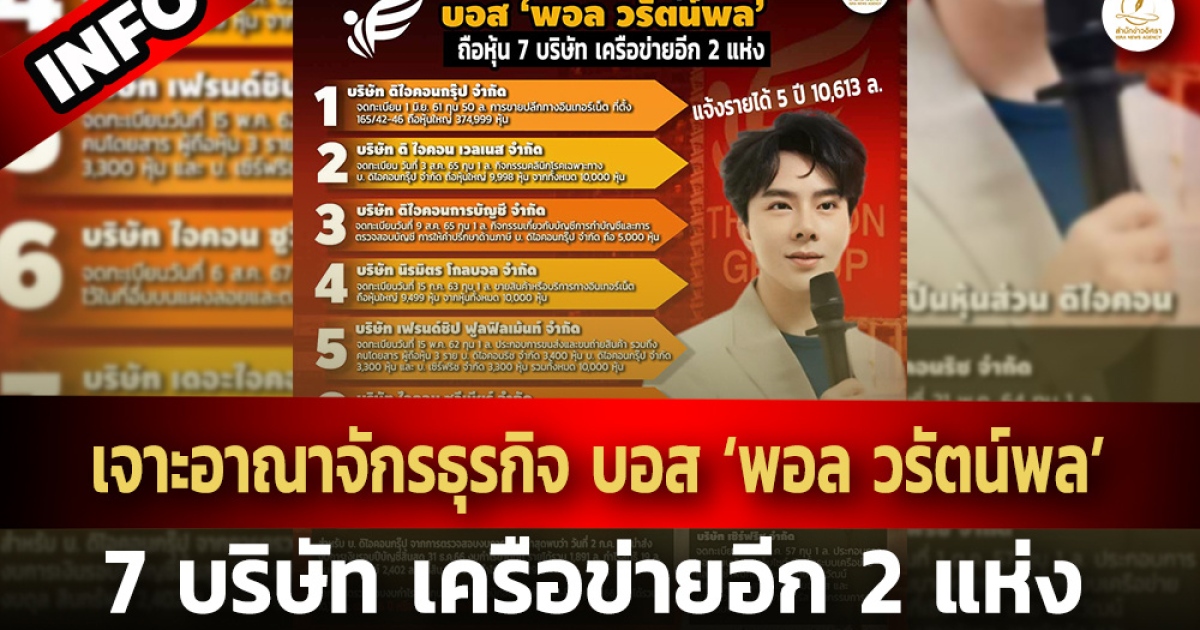 15 ต.ค. 2567 สำนักงานป้องกันและปราบปรามการฟอกเงิน (ปปง.) เผยแพรข่าว คำสั่งที่ ย 214/2567 อายัดทรัพย์สินของ บริษัท ดิโอคอนกรุ๊ป จำกัด นายวรัตน์พล วรัทย์วรกุล หรือบอสพอลกับพวก สำนักข่าวอิศราสืบค้นข้อมูลเครือข่ายธุรกิจของนายวรัตน์พล 9 บริษัท มานำเสนอผ่านภาพอินโฟกราฟิก ดังนี้