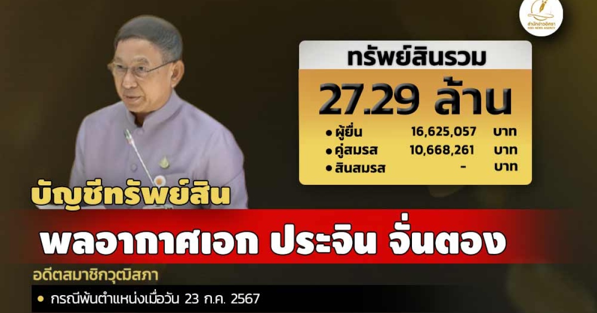 สำนักงานคณะกรรมการป้องกันและปราบปรามการทุจริตแห่งชาติ (ป.ป.ช.) เปิดเผยบัญชีแสดงทรัพย์สินและหนี้สินของ พลอากาศเอก ประจิน จั่นตอง อดีตสมาชิกวุฒิสภา ทรัพย์สิน 27.29 ล. ประกอบด้วย เงินฝาก 9 บัญชี มูลค่ารวม 5.05 ล. ที่ดิน 13 แปลง มูลค่ารวม 7.13 ล. โรงเรือนและสิ่งปลูกสร้าง 1 หลัง มูลค่ารวม 67,500 บาท ผู้ยื่นมีรายได้ต่อปีโดยประมาณ 6 ล.