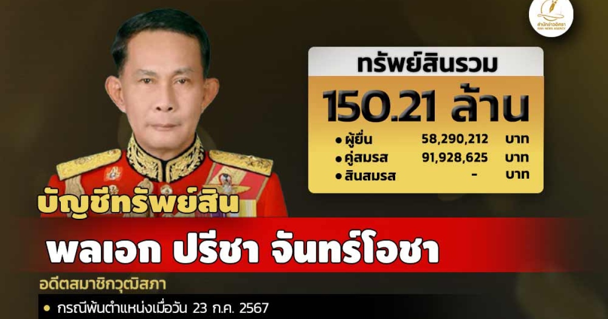 สำนักงานคณะกรรมการป้องกันและปราบปรามการทุจริตแห่งชาติ (ป.ป.ช.) เปิดเผยบัญชีแสดงทรัพย์สินและหนี้สินของ พลเอก ปรีชา จันทร์โอชา อดีตสมาชิกวุฒิสภา ทรัพย์สิน 150.21 ล. ประกอบด้วย เงินฝาก 17 บัญชี มูลค่ารวม 106.72 ล. ที่ดิน 7 แปลง มูลค่ารวม 12.10 ล. โรงเรือนและสิ่งปลูกสร้าง 2 หลัง มูลค่ารวม 15.64 ล. ผู้ยื่นมีรายได้ต่อปีโดยประมาณ 3.17 ล.