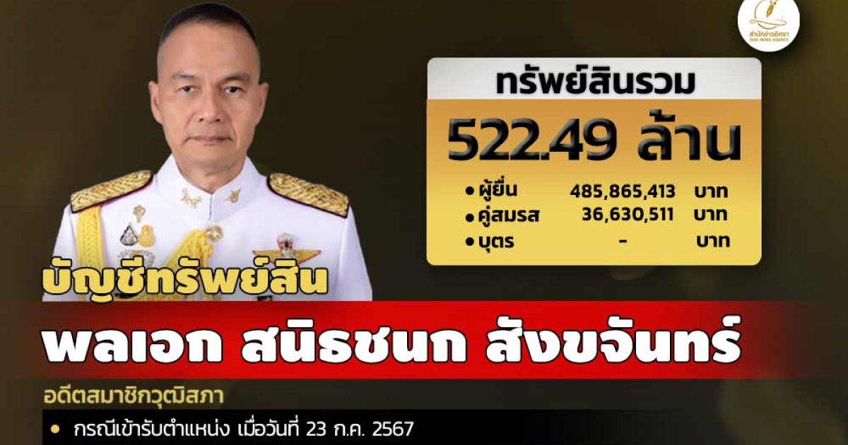 สำนักงานคณะกรรมการป้องกันและปราบปรามการทุจริตแห่งชาติ (ป.ป.ช.) เปิดเผยบัญชีแสดงทรัพย์สินและหนี้สินของ พลเอก สนิธชนก สังขจันทร์ อดีตสมาชิกวุฒิสภา ทรัพย์สิน 522.49 ล. ประกอบด้วย เงินสด 800,000 บาท เงินฝาก 39 บัญชี มูลค่ารวม 53,25 ล. โรงเรือนและสิ่งปลูกสร้าง 14 หลัง มูลค่า 1.37 ล. ผู้ยื่นแจ้งมีรายได้ต่อปีโดยประมาณ 3.81 ล.