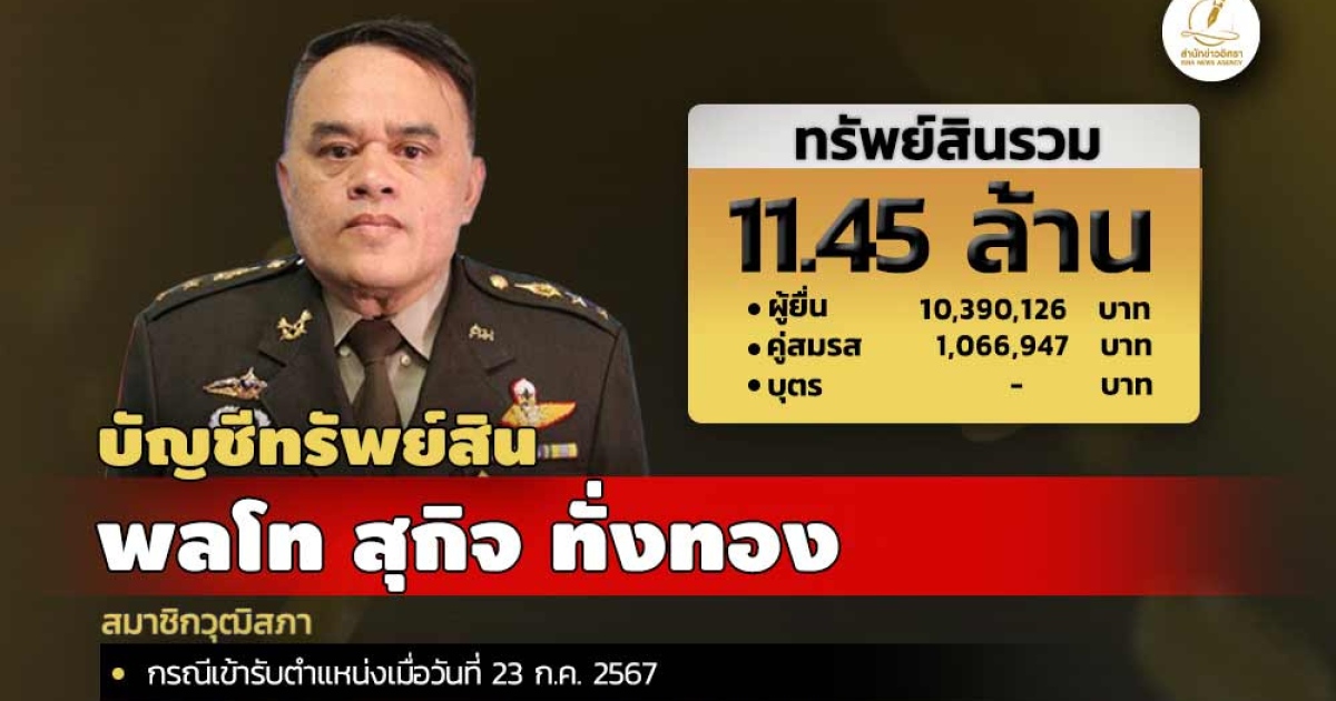 สำนักงานคณะกรรมการป้องกันและปราบปรามการทุจริตแห่งชาติ (ป.ป.ช.) เปิดเผยบัญชีแสดงทรัพย์สินและหนี้สินของ พลโท สุกิจ ทั่งทอง สมาชิกวุฒิสภา ทรัพย์สิน 11.45 ล. ประกอบด้วย เงินฝาก 8 บัญชี มูลค่ารวม 904,753 บาท ที่ดิน 4 บัญชี มูลค่ารวม 6.55 ล. โรงเรือนและสิ่งปลูกสร้าง 1 หลัง มูลค่า 1.50 ล. ผู้ยื่นแจ้งมีรายได้ต่อปีโดยประมาณ 2.28 ล.