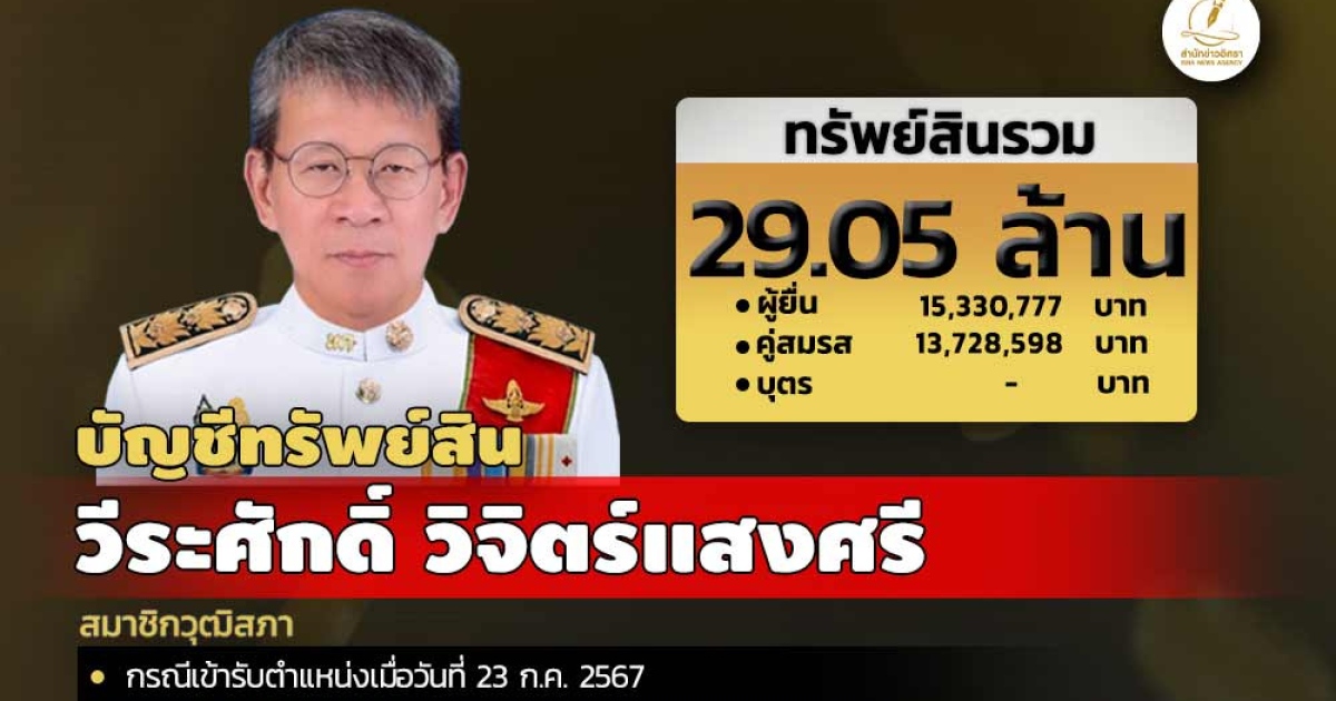 สำนักงานคณะกรรมการป้องกันและปราบปรามการทุจริตแห่งชาติ (ป.ป.ช.) เปิดเผยบัญชีแสดงทรัพย์สินและหนี้สินของ วีระศักดิ์ วิจิตร์แสงศรี สมาชิกวุฒิสภา ทรัพย์สิน 29.05 ล. ประกอบด้วย เงินฝาก 15 บัญชี มูลค่ารวม 3.48 ล. ที่ดิน 7 บัญชี มูลค่ารวม 7.24 ล. โรงเรือนและสิ่งปลูกสร้าง 3 หลัง มูลค่า 8 ล. ผู้ยื่นแจ้งมีรายได้ต่อปีโดยประมาณ 1.48 ล.