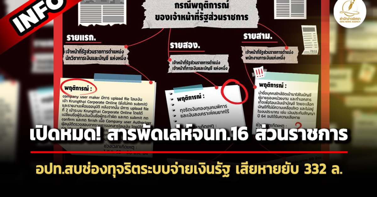 สำนักงานการตรวจเงินแผ่นดิน (สตง.) ตรวจสอบปัญหาเงินขาดบัญชีของหน่วยงานรัฐ พบพฤติการณ์เจ้าหน้าที่ส่วนราชการ และองค์ปกครองส่วนท้องถิ่น (อปท.) จำนวนหลายแห่ง อาศัยช่องโหว่จากการจ่ายเงินผ่านระบบ KTB Corporate Online กระทำการทุจริตในช่วงปี 2563 – 2566 และสร้างความเสียหายเป็นจำนวนเงินกว่า 332 ล้านบาท สำนักข่าวอิศรา จึงนำข้อมูล มานำเสนอผ่านภาพอินโฟกราฟิก ดังนี้