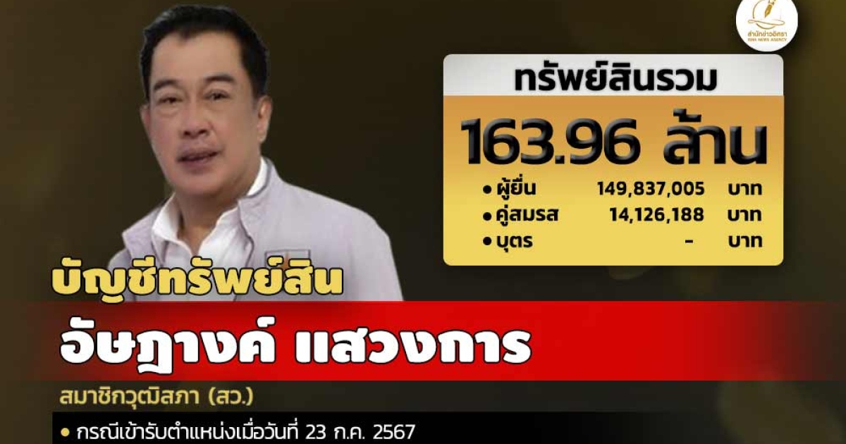 สำนักงานคณะกรรมการป้องกันและปราบปรามการทุจริตแห่งชาติ (ป.ป.ช.) เปิดเผยบัญชีแสดงทรัพย์สินและหนี้สินของ อัษฎางค์ แสวงการ สมาชิกวุฒิสภา ทรัพย์สิน 163.96 ล. ประกอบด้วย เงินฝาก 18 บัญชี มูลค่ารวม 5.40 ล. โรงเรือนและสิ่งปลูกสร้าง 12 หลัง มูลค่า 34.48 ล. ผู้ยื่นแจ้งมีรายได้ต่อปี 2.43 ล.