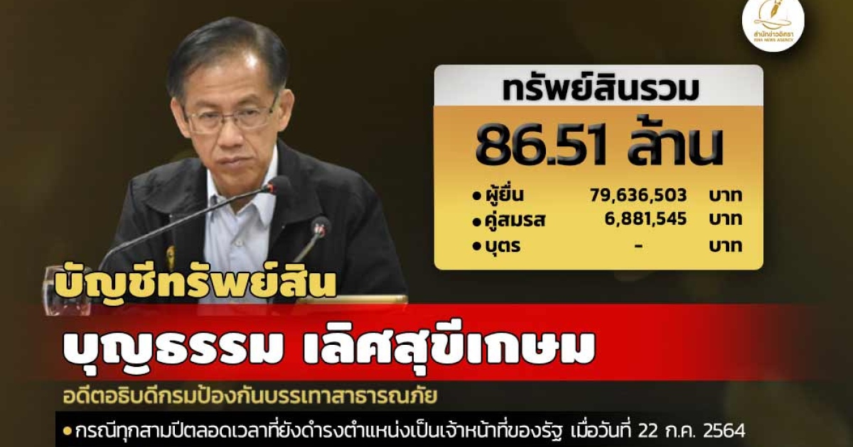 สำนักงานคณะกรรมการป้องกันและปราบปรามการทุจริตแห่งชาติ (ป.ป.ช.) เปิดเผยบัญชีแสดงทรัพย์สินและหนี้สินของ บุญธรรม เลิศสุขีเกษม อดีตอธิบดีกรมป้องกันบรรเทาสาธารณภัย ทรัพย์สิน 86.51 ล. ประกอบด้วย เงินฝาก 17 บัญชี มูลค่ารวม 24.07 ล. ที่ดิน 3 แปลง มูลค่ารวม 50.26 ล. โรงเรือนและสิ่งปลูกสร้าง 1 หลัง มูลค่า 2 ล. ผู้ยื่นแจ้งมีรายได้ต่อปี 4.46 ล.