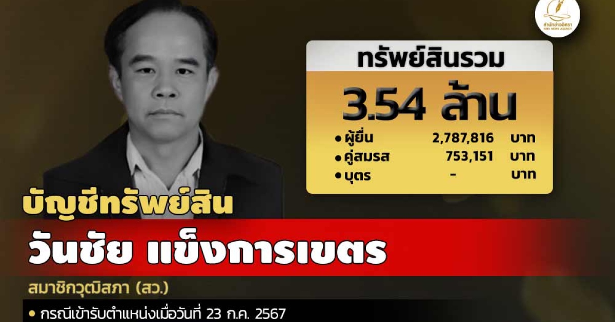 สำนักงานคณะกรรมการป้องกันและปราบปรามการทุจริตแห่งชาติ (ป.ป.ช.) เปิดเผยบัญชีแสดงทรัพย์สินและหนี้สินของ วันชัย แข็งการเขตร สมาชิกวุฒิสภา ทรัพย์สิน 3.54 ล. ประกอบด้วย เงินฝาก 10 บัญชี มูลค่ารวม 176,804 บาท โรงเรือนและสิ่งปลูกสร้าง 1 หลัง มูลค่า 1.93 ล. ผู้ยื่นแจ้งมีรายได้ต่อปี 2.02 ล.