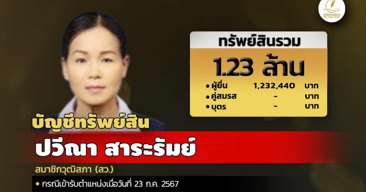 สำนักงานคณะกรรมการป้องกันและปราบปรามการทุจริตแห่งชาติ (ป.ป.ช.) เปิดเผยบัญชีแสดงทรัพย์สินและหนี้สินของ ปวีณา สาระรัมย์ สมาชิกวุฒิสภา ทรัพย์สิน 1.23 ล. ประกอบด้วย เงินฝาก 5 บัญชี มูลค่ารวม 10,853 บาท โรงเรือนและสิ่งปลูกสร้าง 2 หลัง มูลค่า 530,287 บาท ผู้ยื่นแจ้งมีรายได้ต่อปี 1.54 ล.