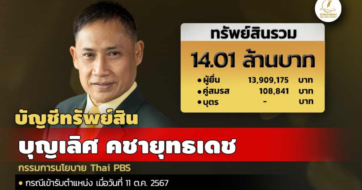 สำนักงานคณะกรรมการป้องกันและปราบปรามการทุจริตแห่งชาติ (ป.ป.ช.) เปิดเผยบัญชีแสดงทรัพย์สินและหนี้สินของ บุญเลิศ คชายุทธเดช กรรมการนโยบาย Thai PBS ทรัพย์สิน 14.01 ล. ประกอบด้วย เงินฝาก 8 บัญชี มูลค่ารวม 2.46 ล. โรงเรือนและสิ่งปลูกสร้าง บ้าน 1 หลัง อาคารชุด 2 หน่วย มูลค่ารวม 10.50 ล. ผู้ยื่นแจ้งมีรายได้ต่อปี 126,000 บาท