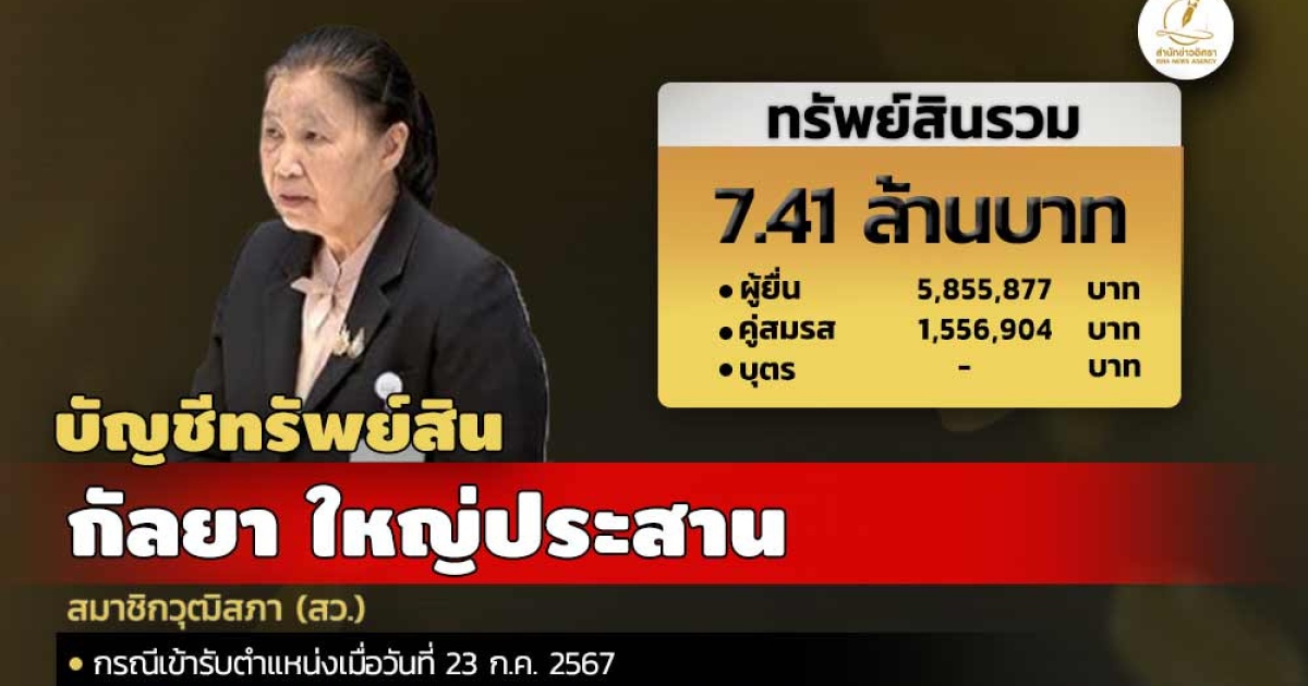 สำนักงานคณะกรรมการป้องกันและปราบปรามการทุจริตแห่งชาติ (ป.ป.ช.) เปิดเผยบัญชีแสดงทรัพย์สินและหนี้สินของ กัลยา ใหญ่ประสาน สมาชิกวุฒิสภา ทรัพย์สิน 7.41 ล. ประกอบด้วย เงินฝาก 26 บัญชี มูลค่ารวม 5.96 ล. โรงเรือนและสิ่งปลูกสร้าง บ้าน 7 หลัง มูลค่ารวม 4.07 ล. ผู้ยื่นแจ้งมีรายได้ต่อปี 998,000 บาท