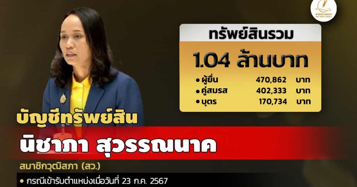 สำนักงานคณะกรรมการป้องกันและปราบปรามการทุจริตแห่งชาติ (ป.ป.ช.) เปิดเผยบัญชีแสดงทรัพย์สินและหนี้สินของ นิชาภา สุวรรณนาค สมาชิกวุฒิสภา ทรัพย์สิน 1.04 ล. ประกอบด้วย เงินฝาก 12 บัญชี มูลค่ารวม 581,929 บาท ผู้ยื่นแจ้งมีรายได้ต่อปี 240,000 บาท